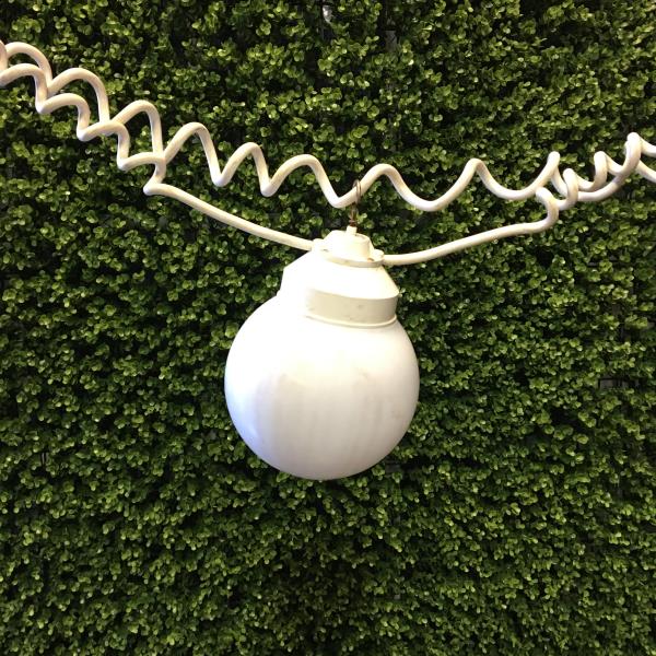 • White approx 6″ round globe lights are strung down a white spiral electrical cord