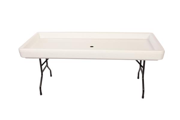 Center of table has a drain with a plug underneth for the water to drain as the ice melts